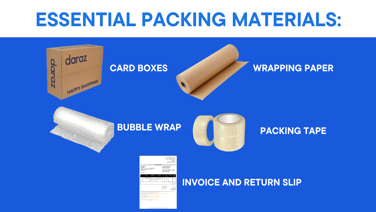 • Cardboard boxes: Select sturdy boxes in appropriate sizes for your products. Daraz offers branded packaging materials you can order